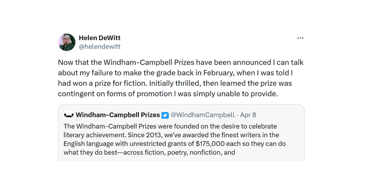 So she wrote a tweet: “Now that the Twatworth-Farnham Prizes have been announced, I can talk about how their unconscionable demands led me to turn down...”
