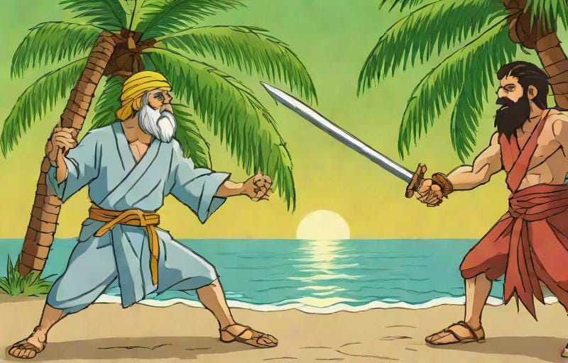 The illustration shows Plato (I assume, since he is the older-looking one) unarmed against a sword-wielding Aristotle. I'll place my bet on Aristotle, thank you. Maybe one day we will have the full text of some of his dialogues, highly esteemed in ancient times but known to us only in fragments.